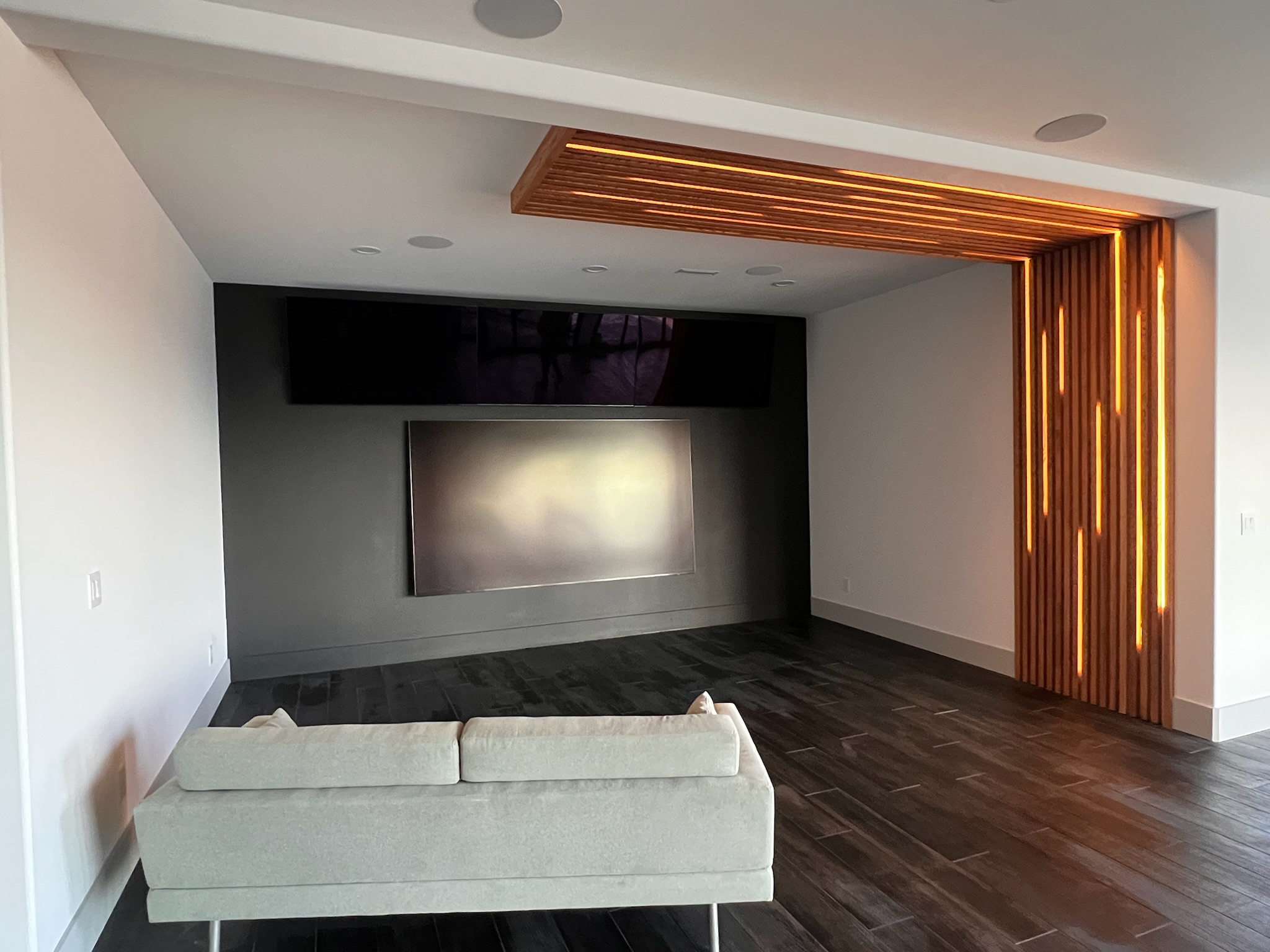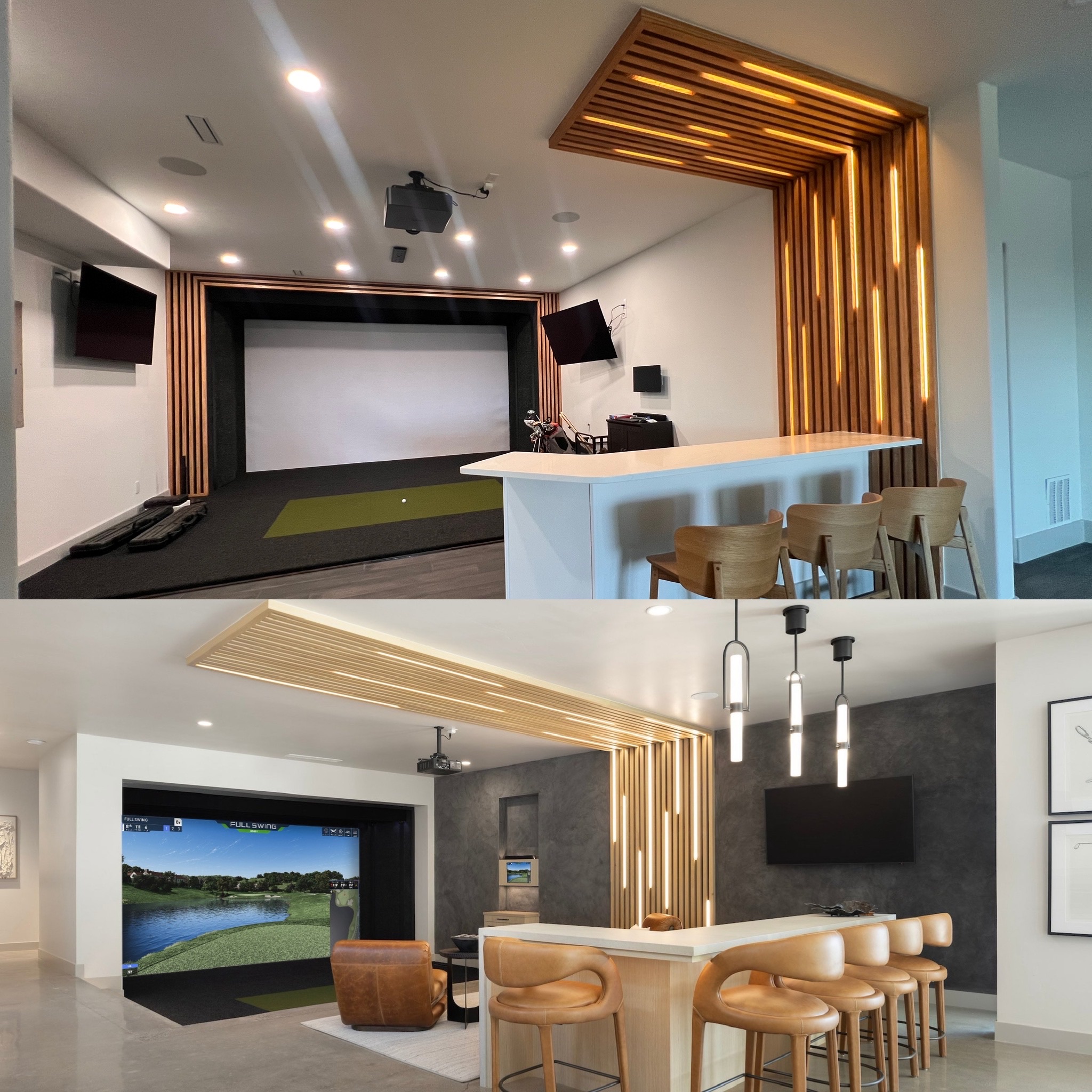 Framing and finishing a golf simulator, including custom wood features