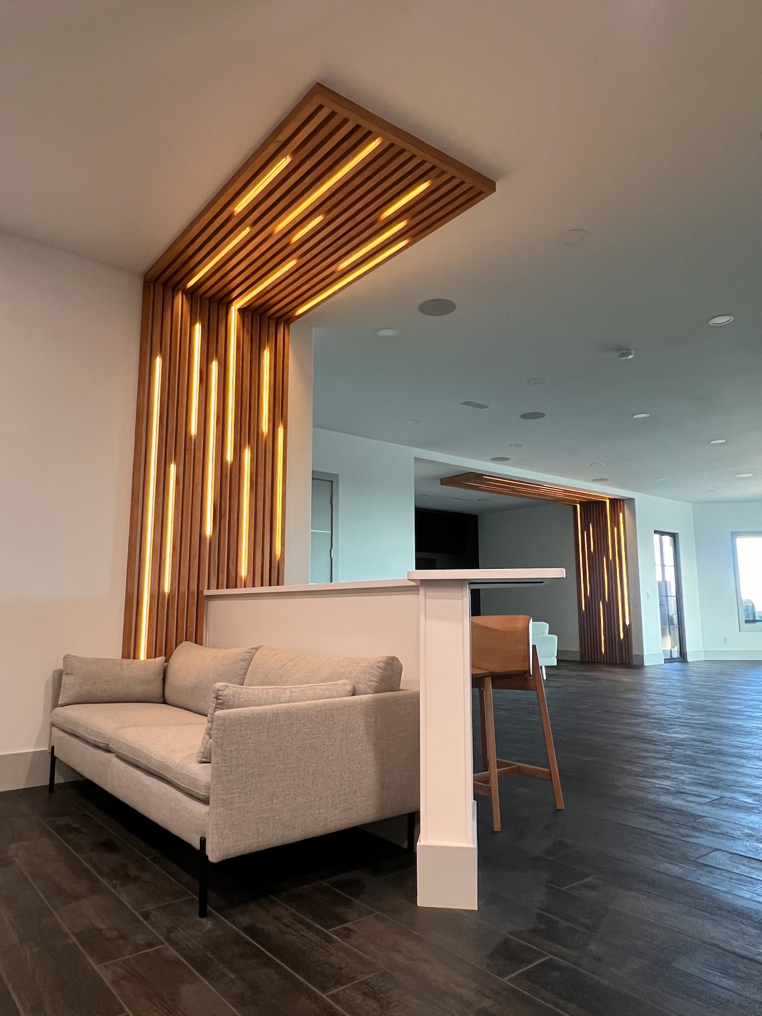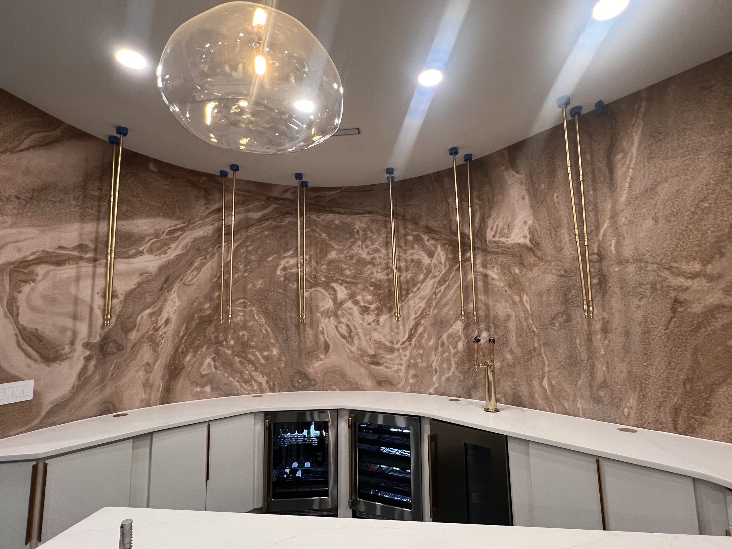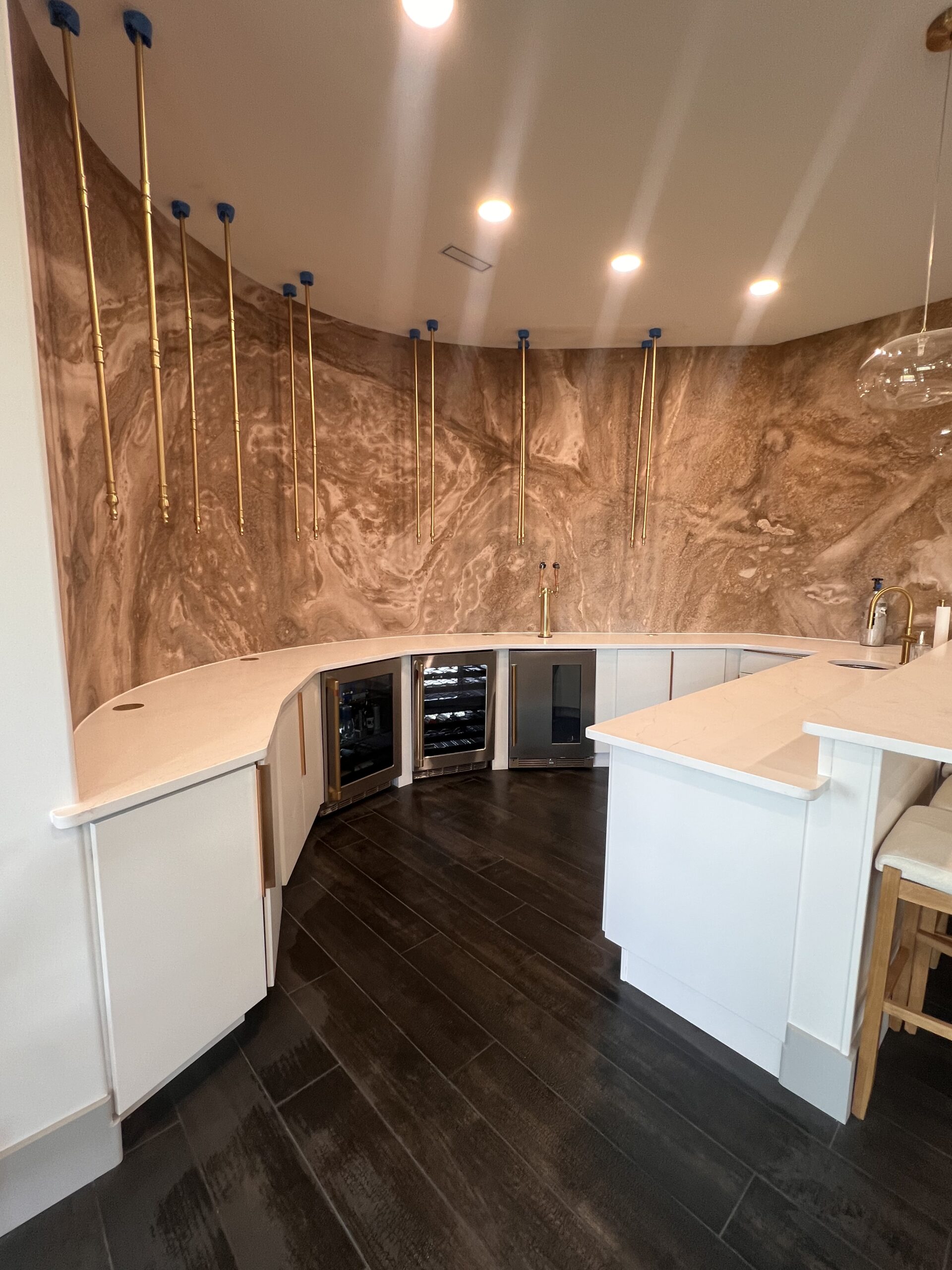 - Full bar kitchenette install complete with custom cabinetry & hardware, mural installation, stone bar, kitchen countertops, and luxury appliances
