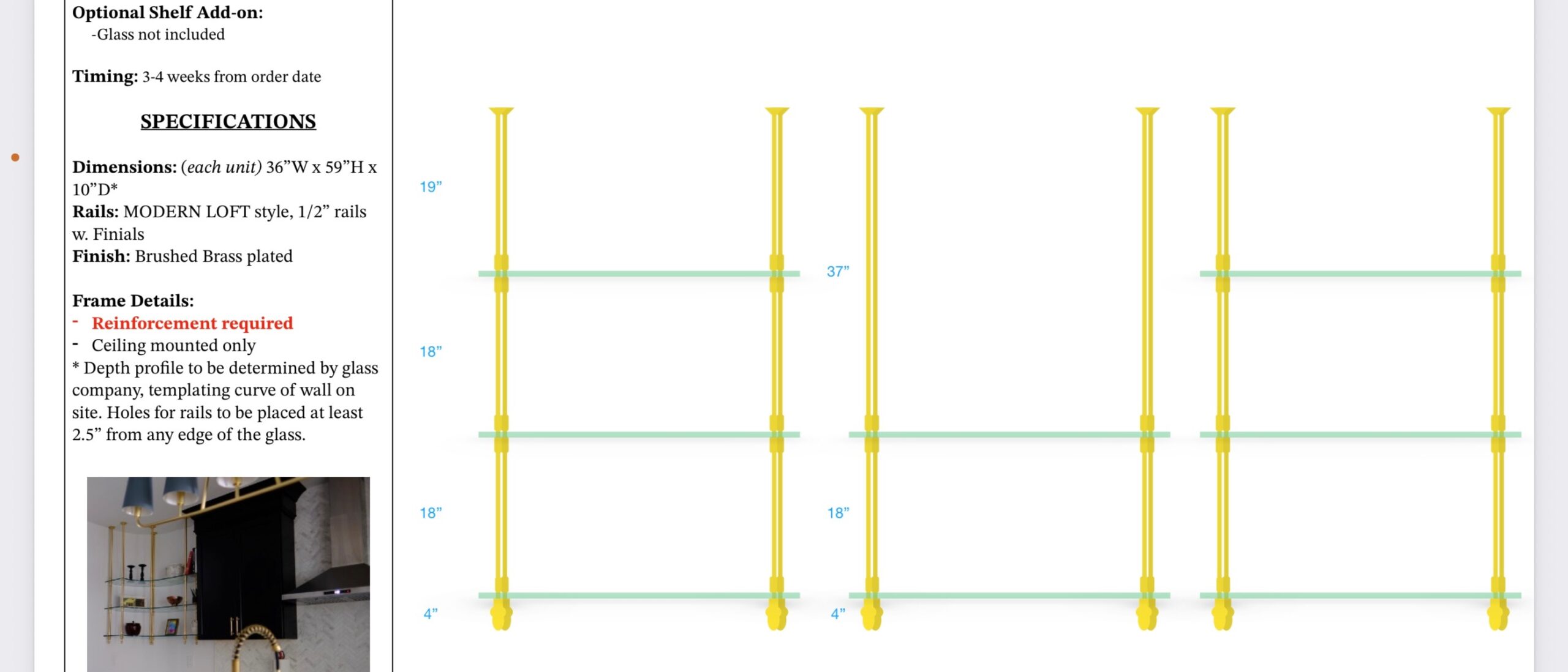 - Custom floating gold and glass shelves